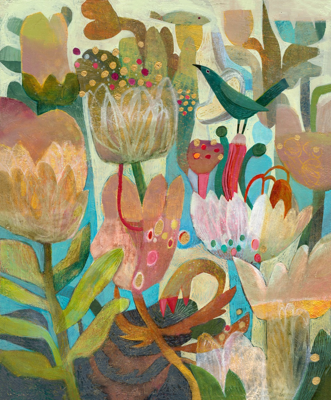 Dreaming of Fish is a stylised floral painting in soft pastel colours. A green bird and small fish can be found amongst the flowers. This image is in a portrait format and will suit different settings including a bedroom or informal living room or sun room.